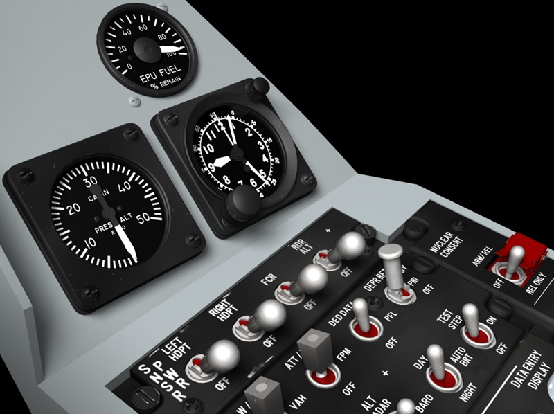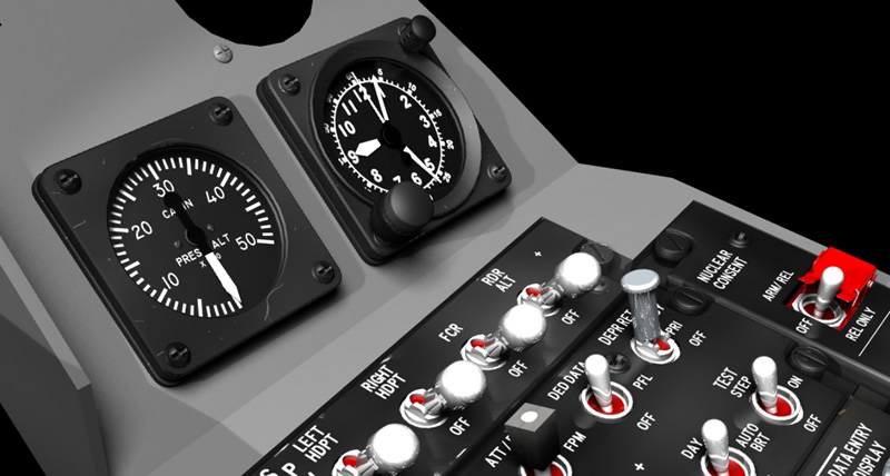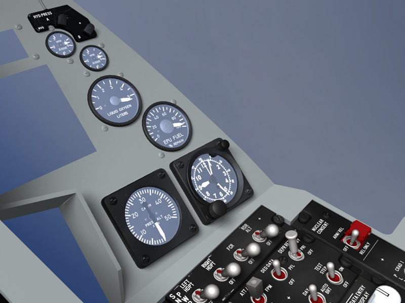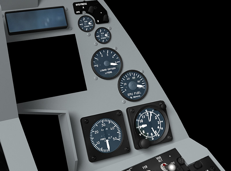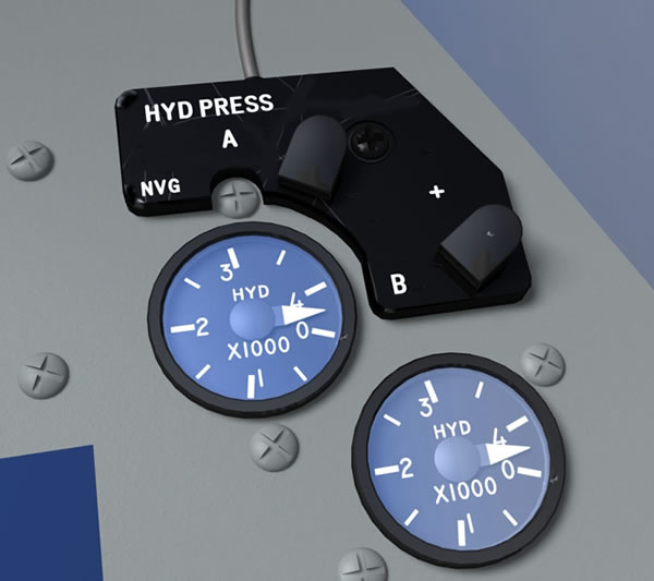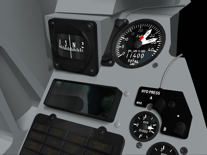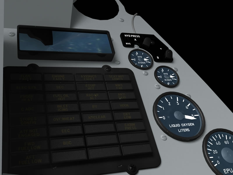 Today I've added the liquid oxygen guage, the two hydraulic guages and the surround that fits above them. The surround I've modelled is based on the version which has been retro fitted with NVG lights. I've also added the Pilot Fault Display today and have been playing around with reflections.