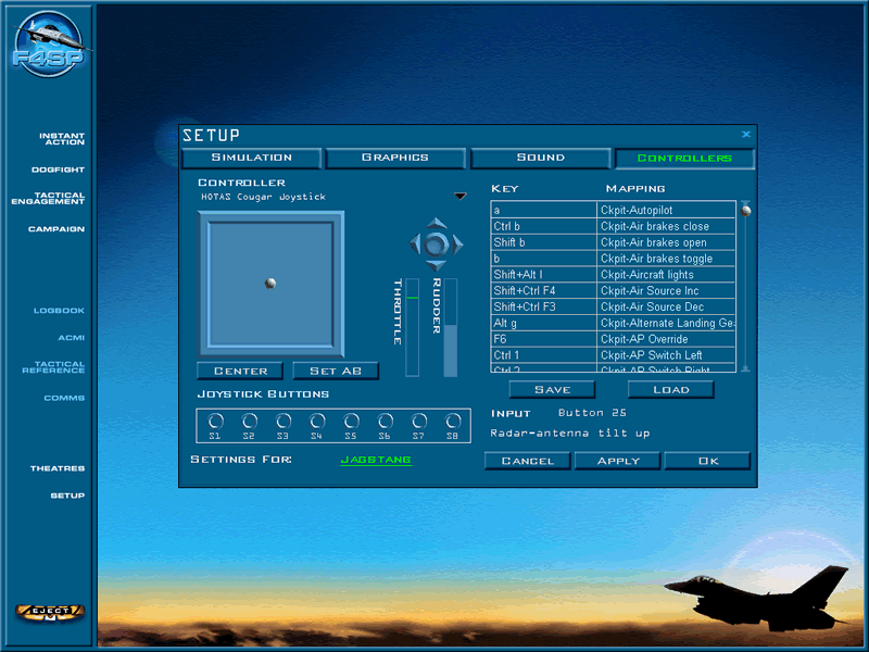 This is a complete guide to setting up my Falcon 4 SP3 / SP4 Cougar files. You must have downloaded my SP3/4 files and placed them into your Foxy\files> folder to be able to complete this guide. You must also have the latest version of the HOTAS Cougar drivers, which are available from http://www.thrustmaster.com